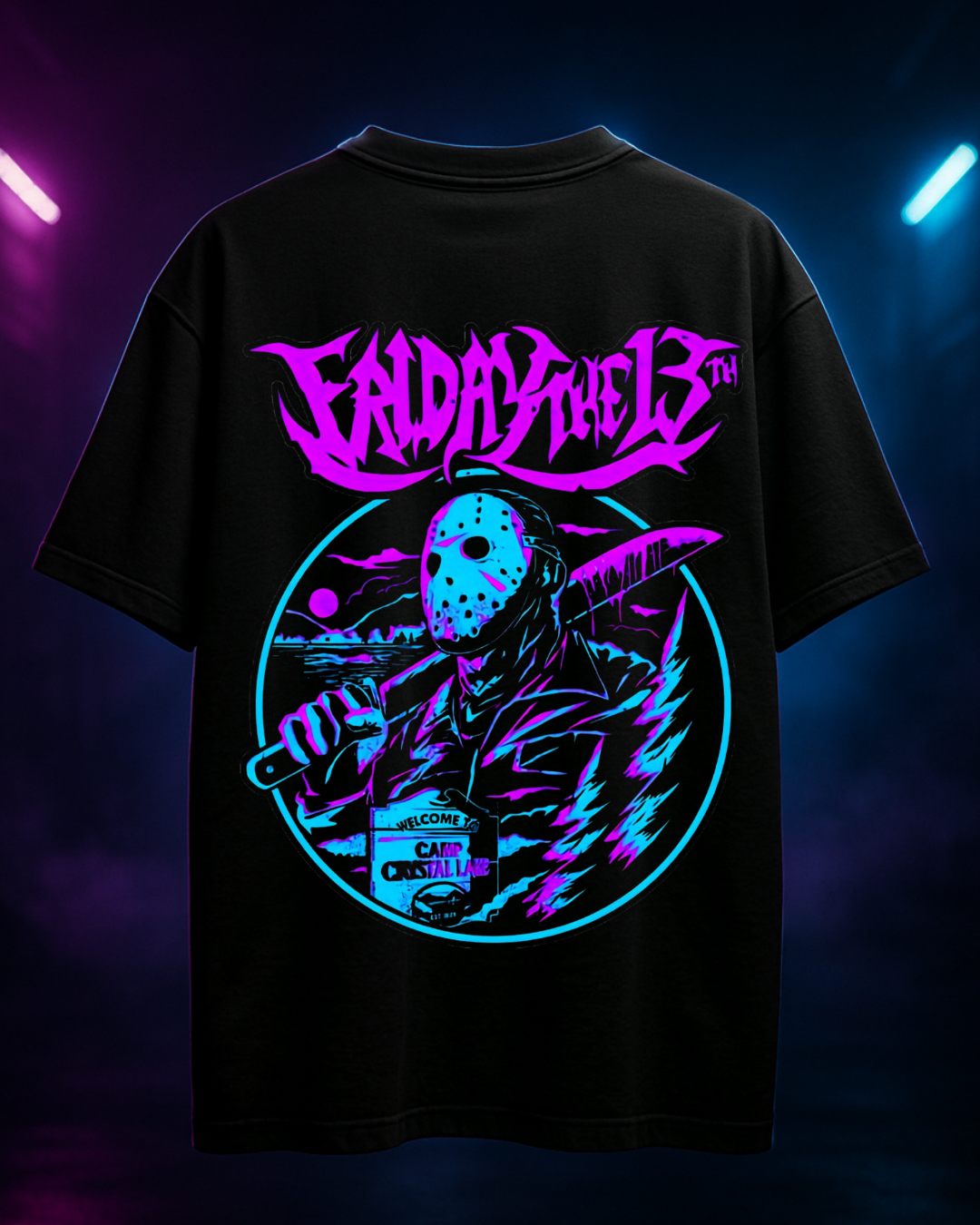 Welcome to Camp Crystal Lake. Where summer nights turn deadly and the legend never dies. This electrifying neon design brings the iconic slasher straight out of the shadows with vibrant purple and cyan hues that scream '80s horror nostalgia. Featuring the unmistakable hockey mask, machete in hand, and that chilling "Friday the 13th" logo—this is for the horror fanatics, the camp counselor survivors, and those who know that some legends refuse to stay buried. Wear your fear, own the nightmare.